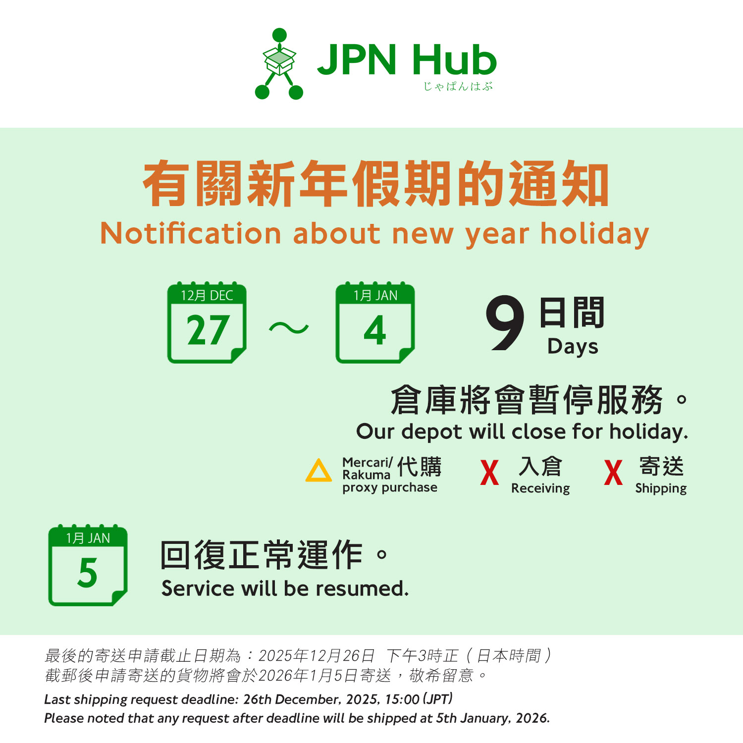在此期間,倉庫將會暫停一切入倉及寄送業務。如有需要,請於12月26日前安排集運,謝謝配合。